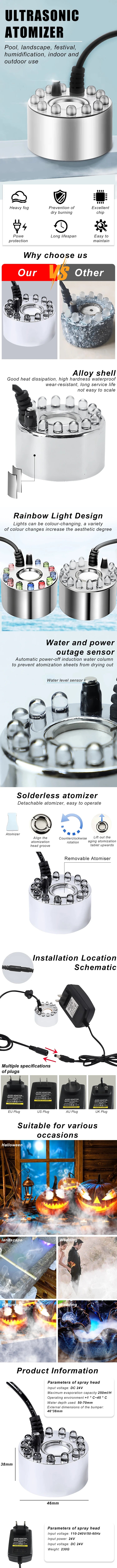 Mist maker with 12 LED lights, Color Changing rotation create fantastic party atmosphere. Mini Fog Machine bring you a surprising effect for your Easter, Christmas, Halloween, and other holiday decoration.
